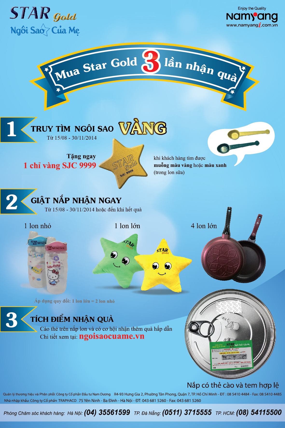 Đặc biệt bắt đầu từ ngày 15/08/2014 đến hết ngày 30/11/2014 khi khách hàng mua các sản phẩm dinh dưỡng STAR GOLD tại các cửa hàng trong cả nước sẽ có 3 cơ hội nhận quà hấp dẫn cùng STAR GOLD: