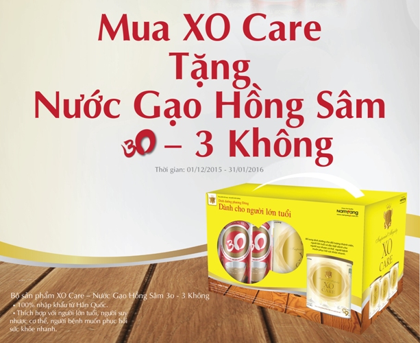 Từ ngày 01.12.2015, khi mua 2 lon nhỏ XO Care hoặc 1 lon lớn XO Care, quý khách sẽ được nhận ngay lốc 6 lon Nước Gạo Hồng Sâm 3o – 3 Không.