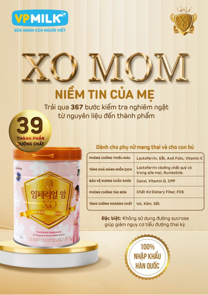 Imperial Mom XO là sản phẩm đặc chế cung cấp dinh dưỡng cần thiết cho bà mẹ mang thai và cho con bú. Sản phẩm sử dụng sữa nguyên chất, được làm từ nguồn sữa tươi lấy tại nông trại, không qua khâu lưu kho, sử dụng phương pháp đóng gói khí Nitơ để giữ trọn nguồn dinh dưỡng phong phú và duy trì hương vị tươi mới của sản phẩm. Imperial Mom XO không sử dụng đường sucrose giúp hạn chế nguy cơ tiểu đường thai kỳ, không sử dụng chất bảo quản/phụ gia thực phẩm, không sử dụng hương liệu.